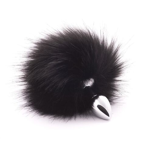 Серебристая анальная пробка с черным хвостиком из искусственного меха