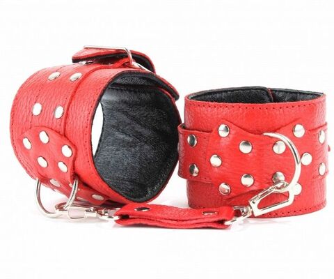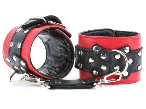 Красные наручники с чёрными проклёпанными ремешками с пряжкой