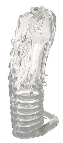 Закрытая прозрачная насадка на пенис с выпуклостями и отростком - 12 см.