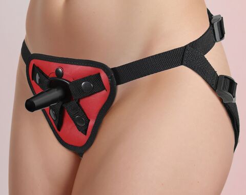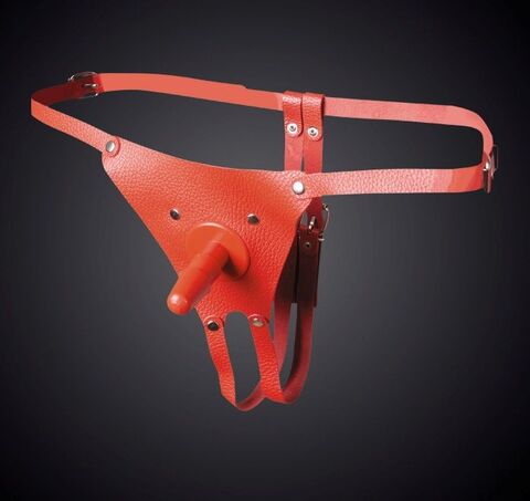 Красный страпон на ремнях с вагинальной пробкой - 15 см.