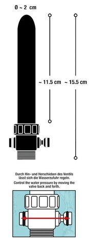 Анальный душ серебристого цвета с 5 отверстиями для струи и стандартной резьбой для душевого шланга с запорным клапаном, который обеспечивает возможность выключения и повторного включения воды по желанию без изменения температуры и давления воды. Кроме того, воздух не всасывается. Рабочая длина - 11,5 см.