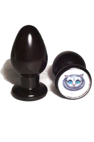 Анальная пробка черного цвета, изготовленная из дерева. Имеет ограничительное основание для безопасного использования. В основании имеет вставку с изображением Чеширского кота