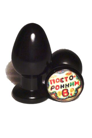 Анальная пробка черного цвета, изготовленная из дерева. Имеет ограничительное основание для безопасного использования. В основании имеет вставку с изображением надписи Посторонним В.