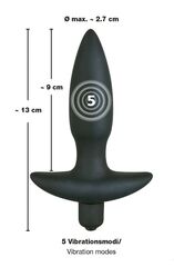 Очень тихий специалист в анальных удовольствиях! Черная анальная втулка с 5 уровнями вибрации, управляемыми простым нажатием кнопки в основании, выполнена из приятного на ощупь шелковистого силикона. Узенький кончик способствует легкому введению. Широкое основание игрушки препятствует глубокому проталкиванию в попку. Рабочая длина - 9 см.