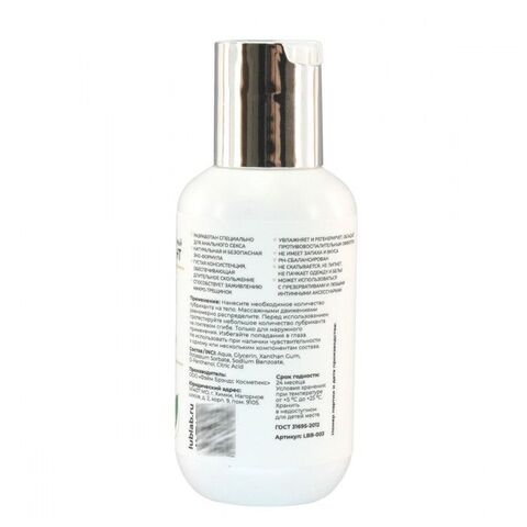 Интимный лубрикант с натуральной и безопасной ЭКО-формулой разработан специально для анального секса. Обладает густой консистенцией, обеспечивающей длительное скольжение. Прозрачный гель абсолютно не имеет запаха и вкуса, способствует заживлению микро-трещинок, благодаря входящему в состав D-пантенолу. Увлажняет и регенерирует, обладает противовоспалительным эффектом. Не скатывается, не липнет, не пачкает одежду и белье, PH-сбалансирован. Может использоваться с презервативами и любыми интимными аксессуарами.