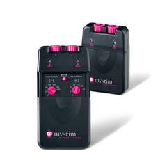 У прибора имеются 2 индивидуально настраиваемых канала для подключения двух электронасадок (для массажа тела или простаты, фаллостимуляции, вагинальной стимуляции). В комплекте: электростимулятор Mystim, 4 самоклеящихся электрода, 2 провода для самоклеящихся электродов, 1 батарея 9 Вольт, инструкция, удобный пластиковый футляр.