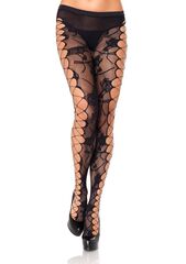 Колготки с ажурным рисунком из роз. Выполнены с открытыми бочками, соединенными имитацией шнуровки.