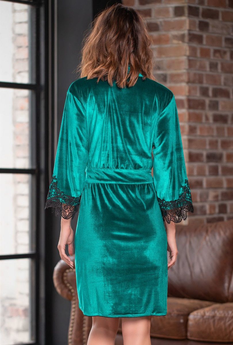 Халат Emerald длиной до колена с застежкой на пуговицы и рукавами 3/4 выполнен из плотного мягкого эластичного бархата актуального изумрудного цвета. Борт и низ рукавов халата декорированы контрастным кантом и ажурным эффектным кружевом черного цвета. На поясе халата декоративные шелковистые кисточки.