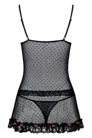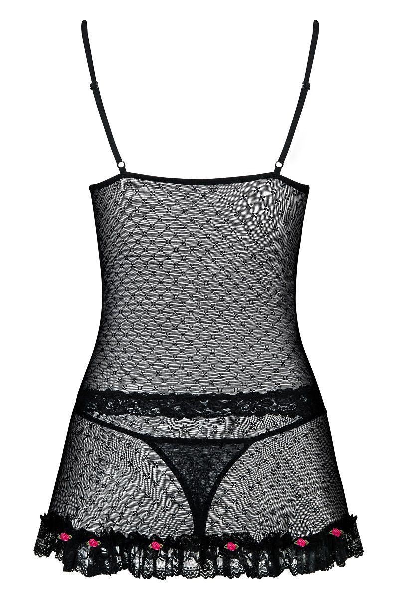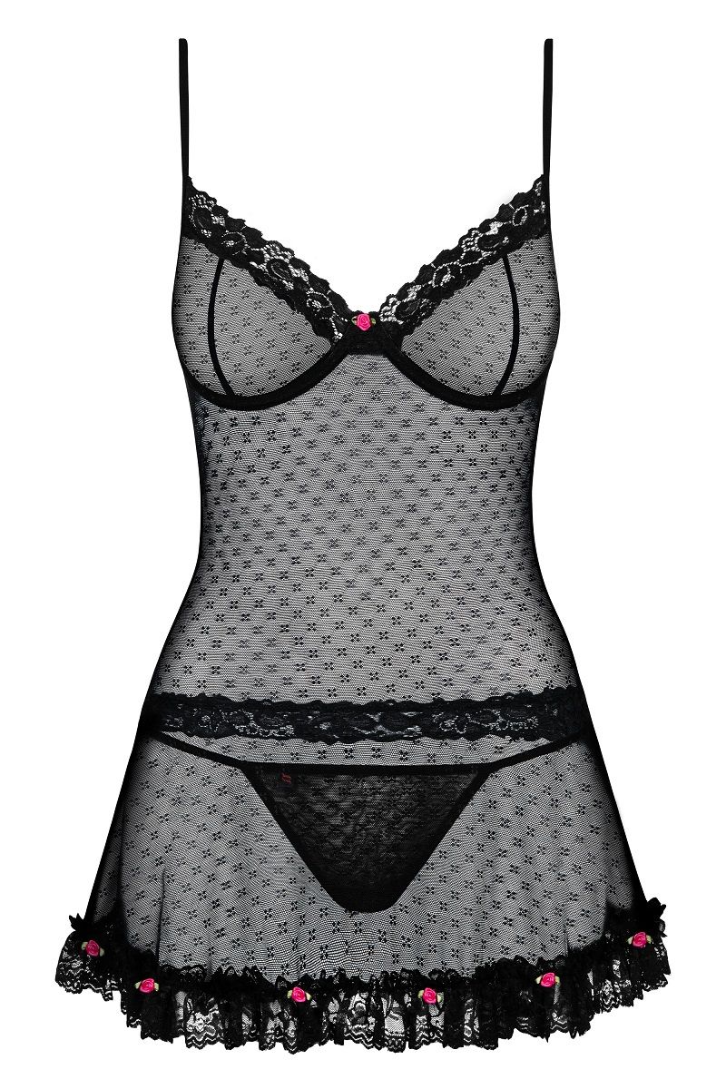 Полупрозрачная сорочка на тонких бретелях, чашка мягкая на косточке, зона декольте, талия и низ изделия украшены кружевом. Кружево внизу сорочки дополняют маленькие розочки. В комплект входят трусики стринги. В комплекте: сорочка, трусики-стринги.