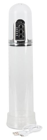Прозрачная автоматическая вакуумная помпа для пениса с серебристой панелью управления с 3 кнопками. Помпа также имеет измерительную шкалу в сантиметрах и дюймах. Перезаряжается с помощью прилагаемого USB-кабеля. Рабочая длина - 20 см.