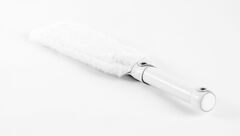 Двусторонняя шлепалка. С одной стороны выполнена из натуральной кожи белого цвета, с другой стороны нежнейший мех. Ручка из натуральной кожи максимально комфортна в руке. Шлепалка при ударе звучит громко и эффектно. Длина ручки - 13 см.