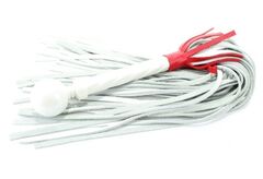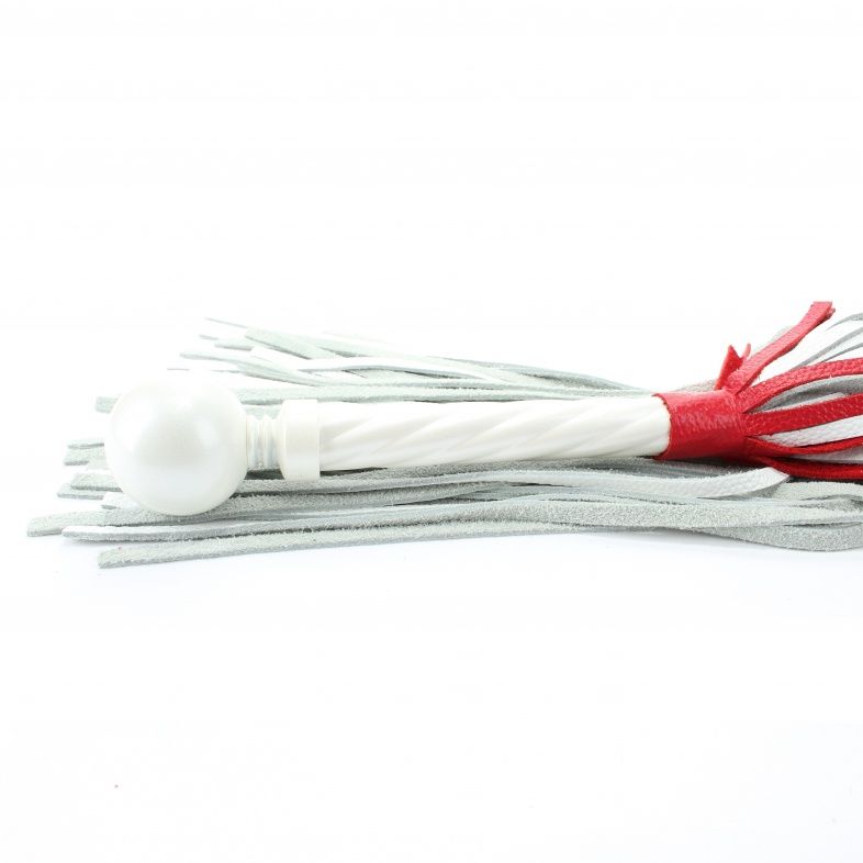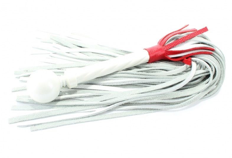 Плеть выполнена из натуральной кожи белого цвета. Витая рукоятка сделана из металла, цвет белый, сверху декор в виде белого шара, внизу ручки отделка из красной кожи. Возбуждающая воображение плеть поможет воплотить задуманное в реальность.