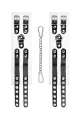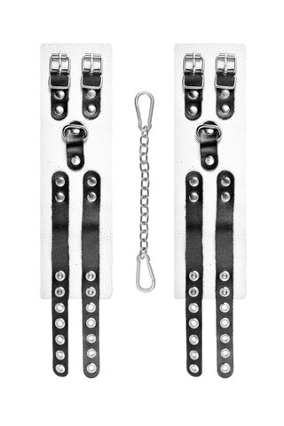 Мягкие оковы с двумя жёсткими ремешками от Pecado помогут обездвижить партнера во время сексуальных прелюдий или жестких БДСМ-играх. Оковы изготовлены полностью из белой, натуральной кожи. Ремешки выполнены из чёрной жёсткой кожи, украшены люверсами. Выделка материала произведена вручную. Ремешки и широкая манжета хорошо держат форму: не тянутся и не мнутся. Качественная металлическая фурнитура добавляет лоска изделию, а аромат натуральной кожи повышает градус возбуждения. Благодаря широкому запасу регулировок, можно подобрать необходимый обхват. Аксессуар удобно застегивать и легко расстегивать. При правильном использовании не оставляет следов на теле и не доставляет дискомфорта. Манжеты оков соединяются между собой помощью двух карабинов и съемной стальной цепочки. Подходит и для женских, и для мужских ног. Длина манжет - 25 см, ширина - 7 см.