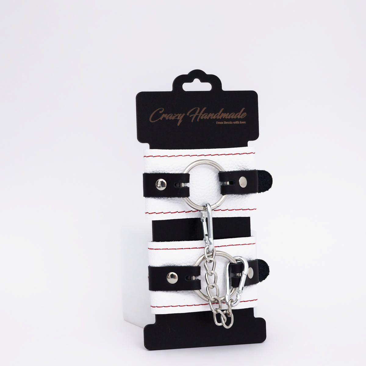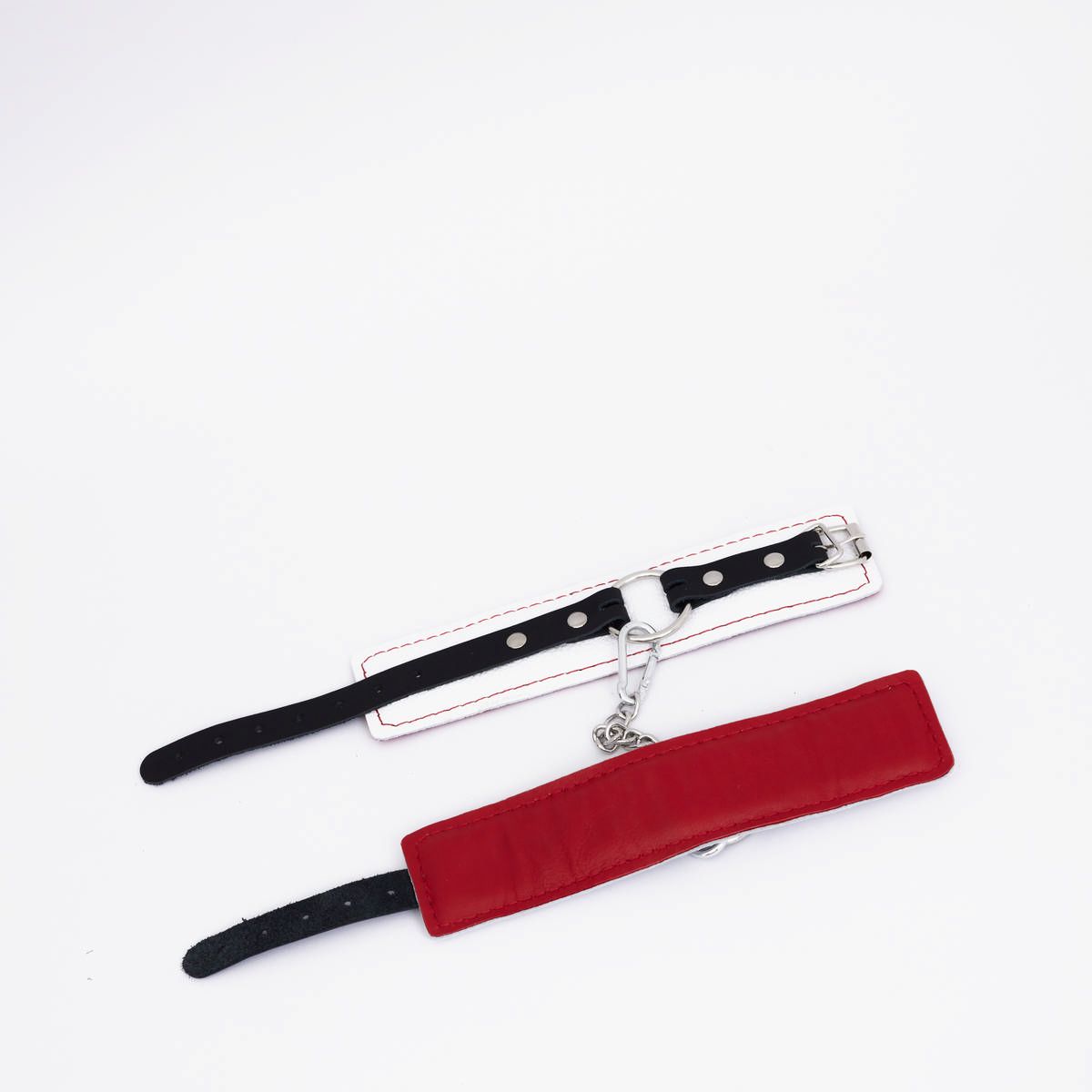 Изделие состоит из двух слоев натуральной кожи : основной слой белого цвета – лицевая часть, и подкладка красного цвета с мягким наполнителем , которая обеспечивает комфортное и безопасное использование, не натирая кожу. Декоративная красная строчка добавляет изделию стильный акцент, подчеркивая его элегантность и игривость.