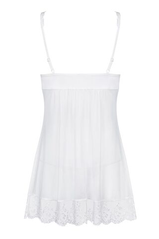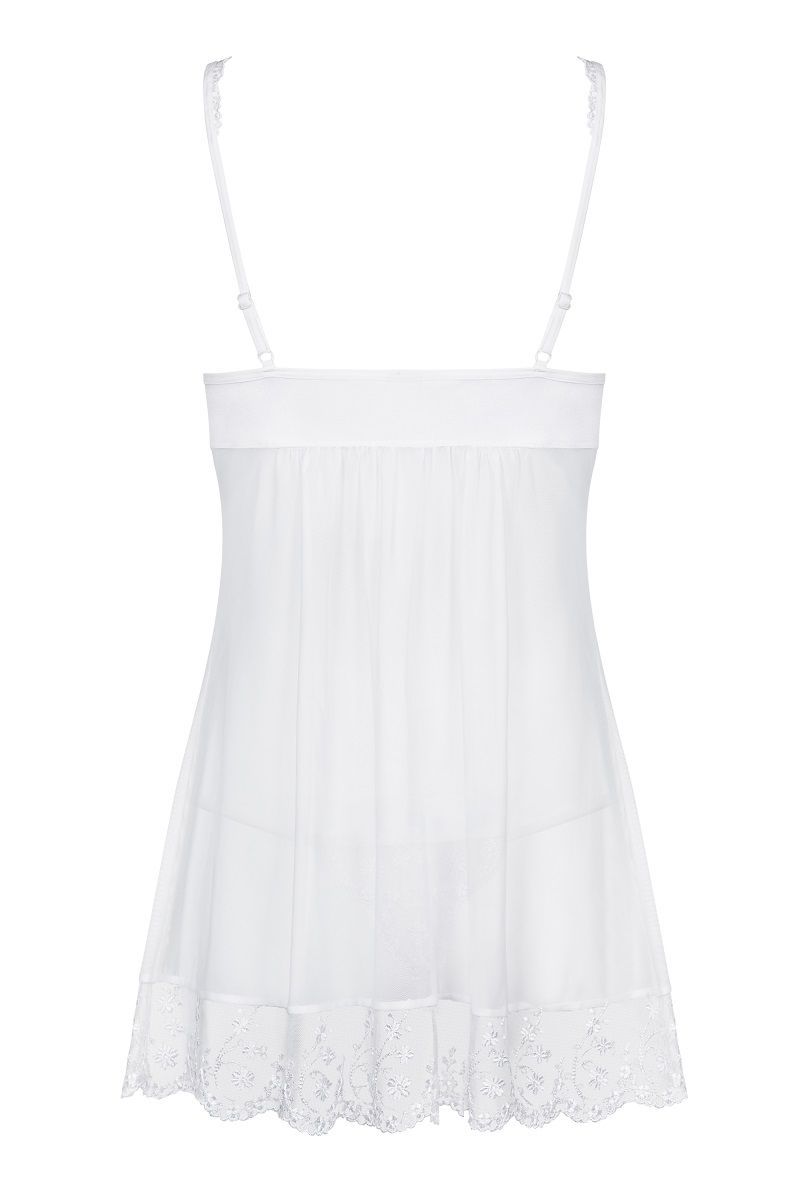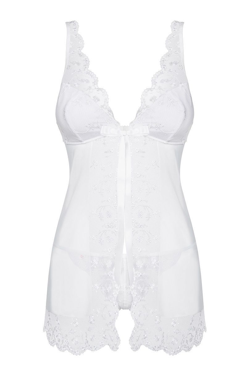 Полупрозрачная сорочка, бретели и полы сорочки украшены вышивкой с цветочным рисунком, чашка мягкая без косточки, зону декольте дополняют атласные ленты, завязывающиеся в бант. В комплект входят трусики стринги, украшенные вышивкой. В комплекте: беби-долл, трусики-стринги.