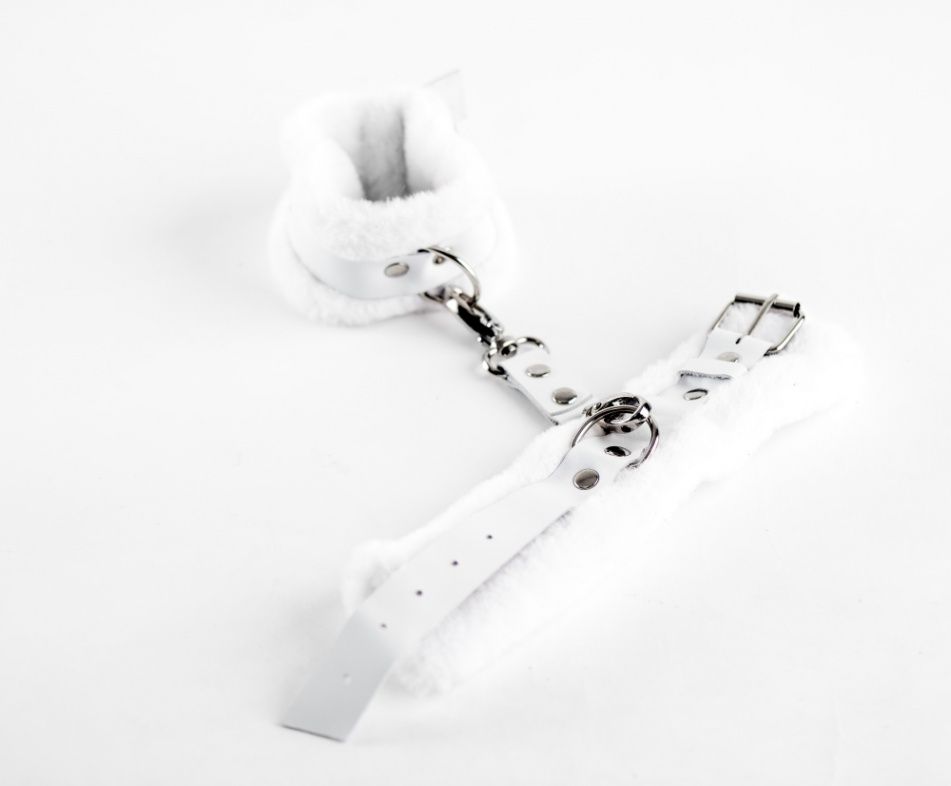Наручники, которые одновременно сковывают и дарят удовольствие! Выполнены из нежнейшего меха. Очень приятны для прикосновений. Ремешки из качественной натуральной кожи белого цвета. Наручники имеют очень нарядный вид. Фурнитура металлическая - сварная, что позволяет выдерживать аксессуару серьезные нагрузки, не смотря на романтичный вид. Размер легко регулируется, благодаря ремешкам. Поэтому наручники прекрасно подойдут при обхвате руки от 15 до 25 см. Ширина - 6 см.