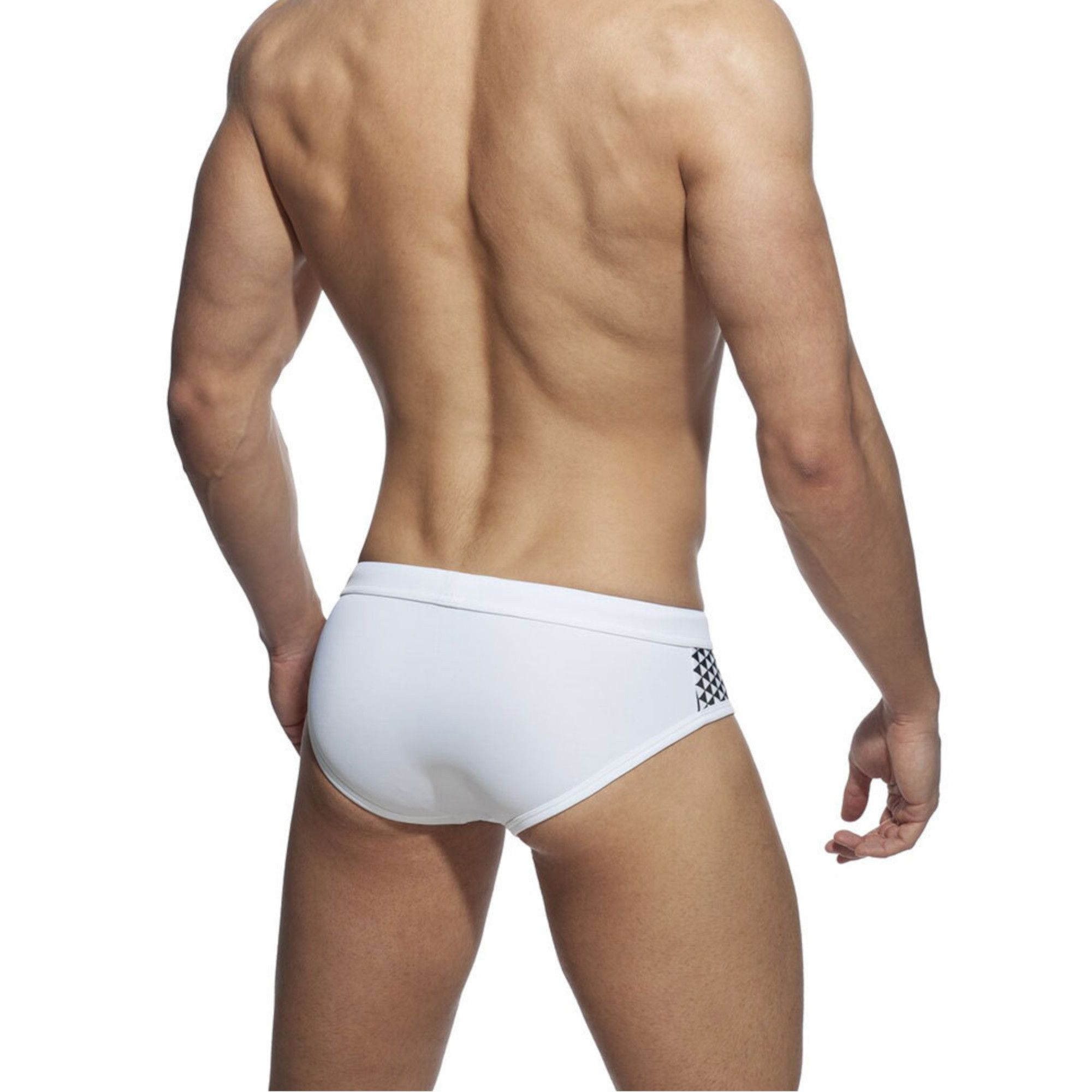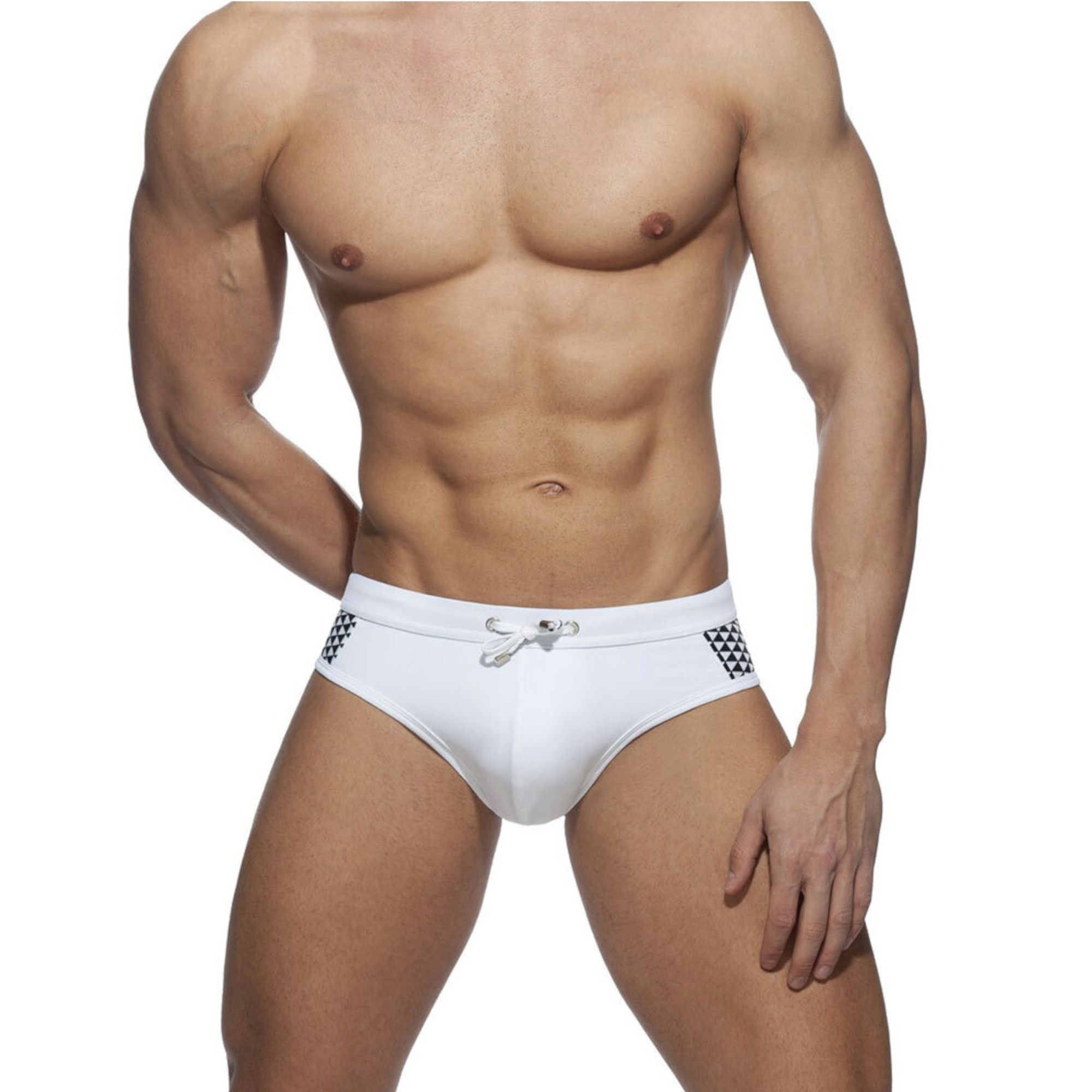 Белые мужские плавки с принтованными боковыми вставками.