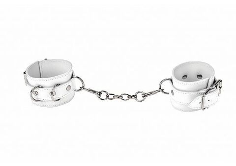 Наручники, изготовленные из качественной кожи с элегантной строчкой. Имеется 6 отверстий для регулировки длины. Украшены заклепками, соединены между собой карабинами. Ширина - 5,5 см.