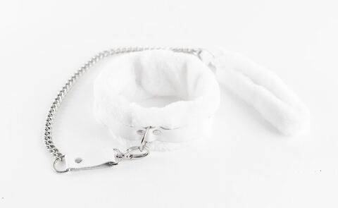 Комплект аксессуаров из ошейника и поводка. Ремешки выполнены из натуральной кожи белого цвета. Нежнейший мех максимально приятен к телу. Размер регулируется. Прекрасно подойдет на окружность шеи от 33 до 45 см. Ширина - 6 см.