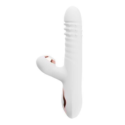 Белый вибратор-кролик с вращающимися шариками и вакуумной стимуляцией. 10 режимов работы. Рабочая длина - 11,5 см.