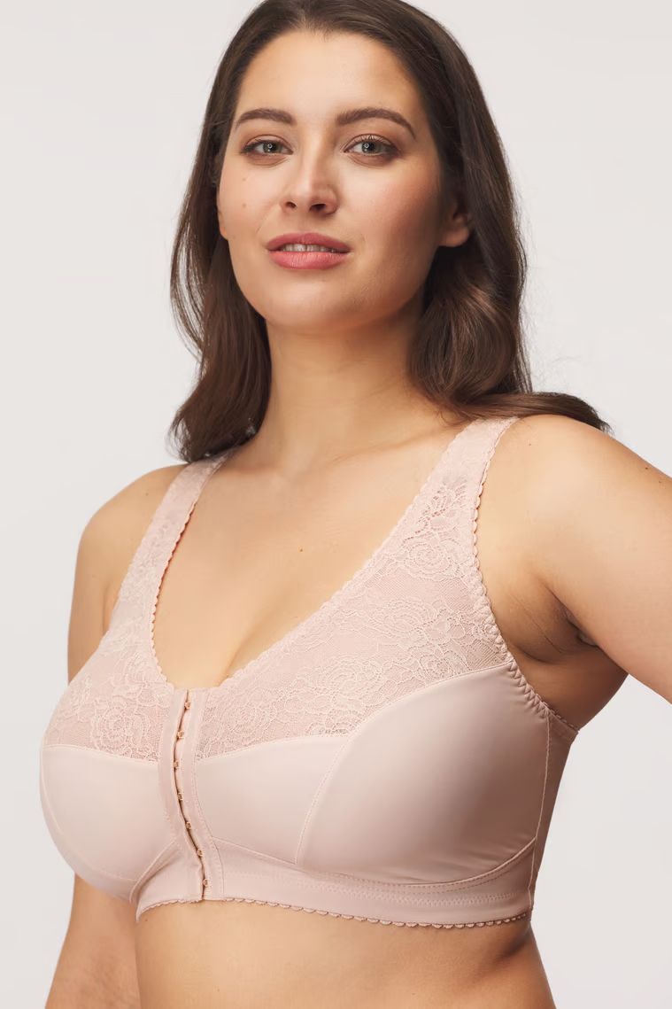 Бюстгальтер Rachela - уникальная модель с застежкой из 7 скрытых крючков спереди. Чашки мягкие, без косточек, шитые из эластичной прочной ткани и кружева, с внутренней стороны пришита сетка, предотвращающая вытягивание ткани чашки. Внутренняя сторона чашек обшита нежной тканью, придающей форму бюстгальтеру. Широкие бретели регулируются по длине, покрыты корсетной пеной, что обеспечивает невероятный комфорт, бретели держат спину в правильном положении, резинка под грудью надёжно поддерживает, фурнитура металлическая крашеная. Спинка из корректирующей сетки, окружность нельзя регулировать. Бюстгальтер Rachela - по-настоящему удобный бескаркасный бюстгальтер на каждый день.