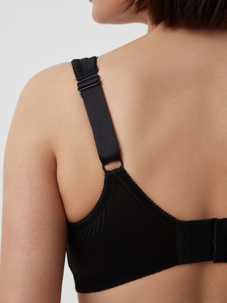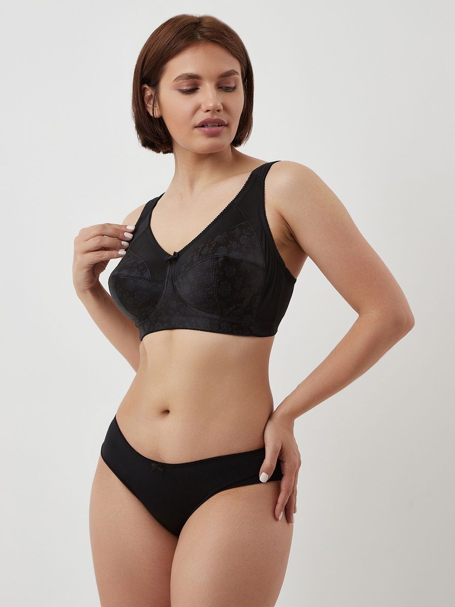 Бюстгальтер бескостный, полностью закрывающий грудь, Т-образная чашка для хорошей посадки, на широком поясе для комфортной поддержки, в боковинах пояса вставлены косточки, чтобы создать красивый силуэт в подмышечной впадине, застежка на четыре крючка в три ряда, бретели широкие с дополнительным кроем на плече, чтоб не натирать и продавливать под весом груди, регулируемые. Ткань гладкая и шелковистая.