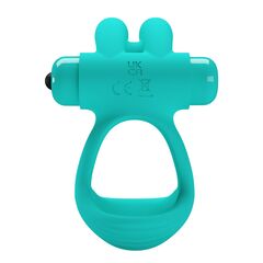 Бирюзовое эрекционное виброкольцо Passionate Dante. С подхватом мошонки и клиторальным зайчиком для ублажения партнёрши. Внутренний диаметр кольца - 3,3 см.