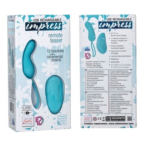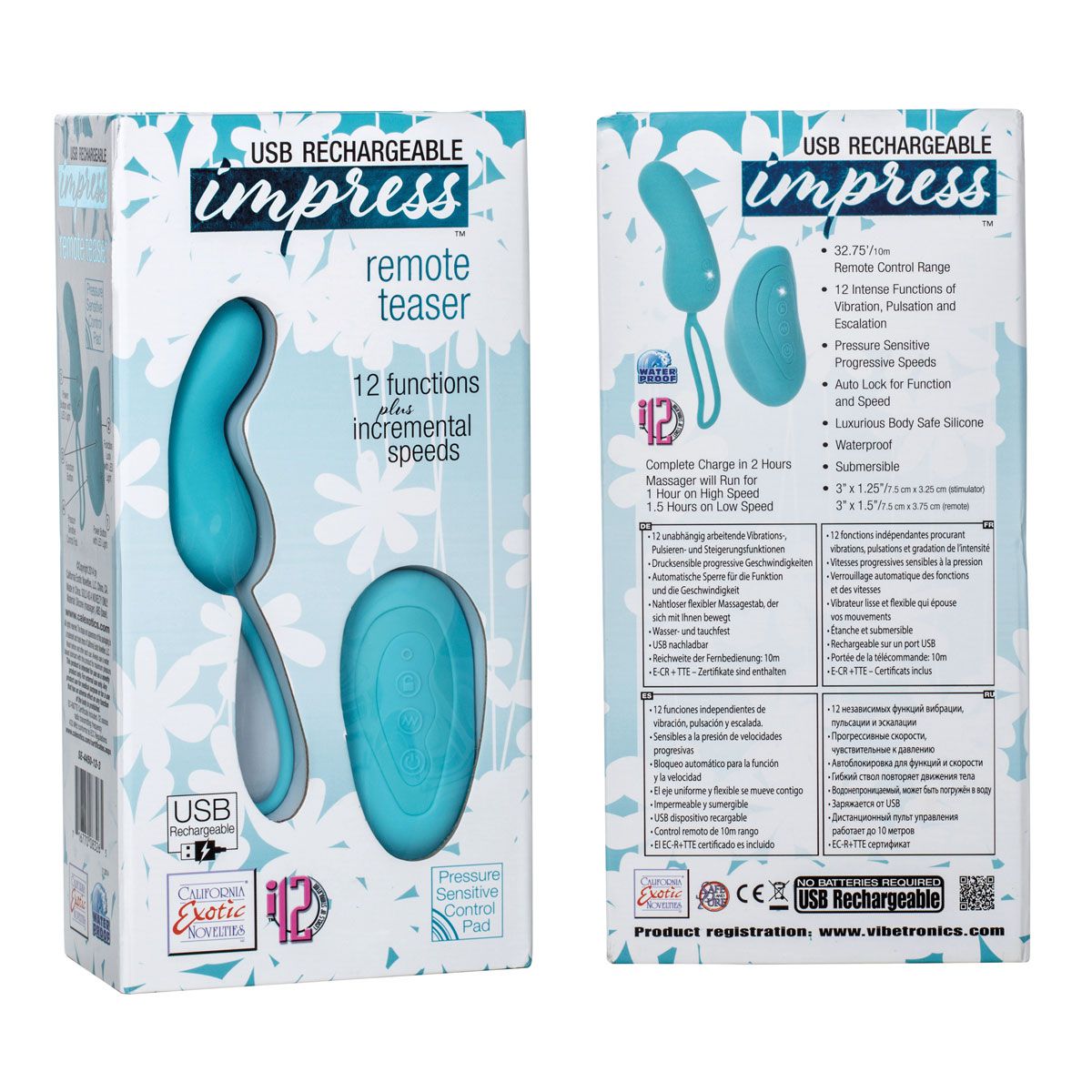 Расширь горизонты удовольствия вместе с IMPRESS USB REMOTE TEASER!!! Автоматическая блокировка. Прогрессивные скорости чувствительные к давлению. Невероятно интенсивная вибрация по всей площади виброяйца. Бесшумное, 100% водонепроницаемое, возможно погружать в воду. Время беспрерывной работы на низкой скорости - 1,5 часа; на высокой - 1 час.