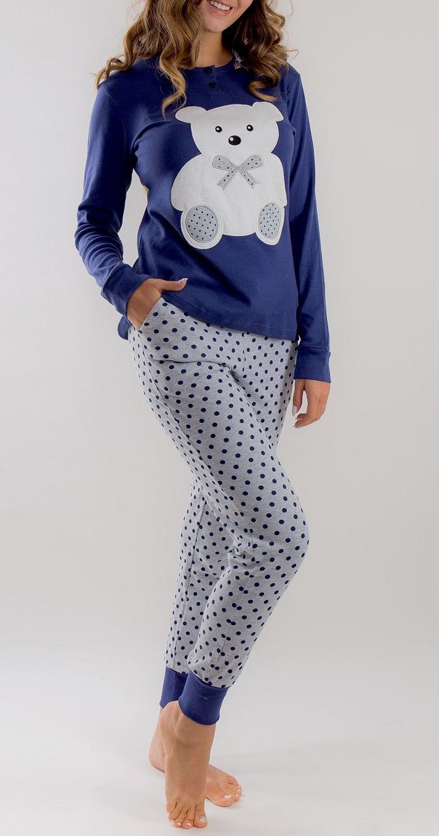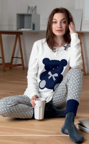 Уютная пижама из плотного интерлока: блуза с застежкой на пуговицах в вырезе горловины с аппликацией-мишкой и набивные брюки в горох. Рукава блузы и края брюк отделаны манжетами. В комплекте: блуза, брюки.
