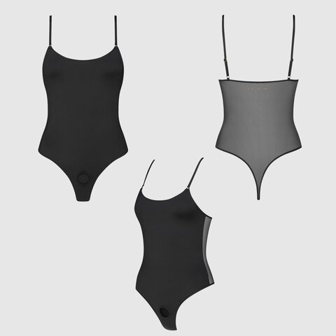 Это гибридная вещь на стыке нижнего белья и одежды: её можно носить как самостоятельный элемент гардероба. Скрытое спереди растяжимое силиконовое кольцо открывает путь к новой эстетике близости, где удовольствие становится частью стиля. Гибридная ткань: 60% микрофибра + 40% тюль.