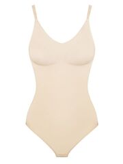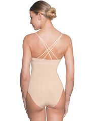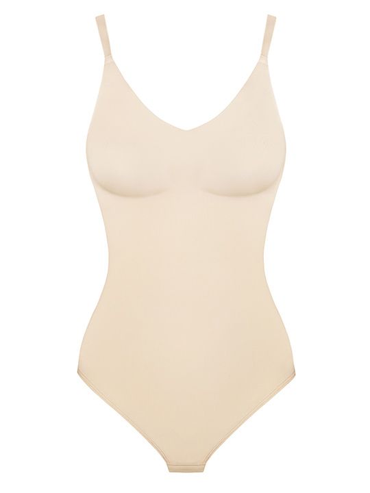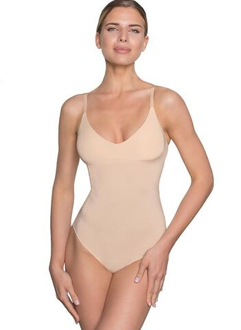 Боди со скрытой конструкцией топа с мягкими чашками без костей. Съемные формованные вкладыши. Регулируемые бретели. Застежка на ластовице в три крючка на две позиции. Выполнено из микрофибры.