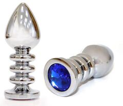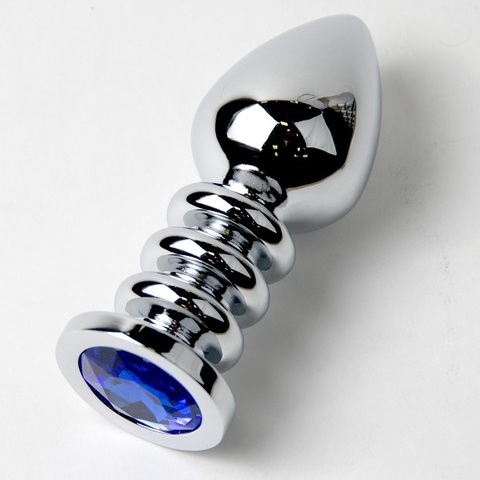 Большая серебристая анальная пробка с синим кристаллом - 10 см.