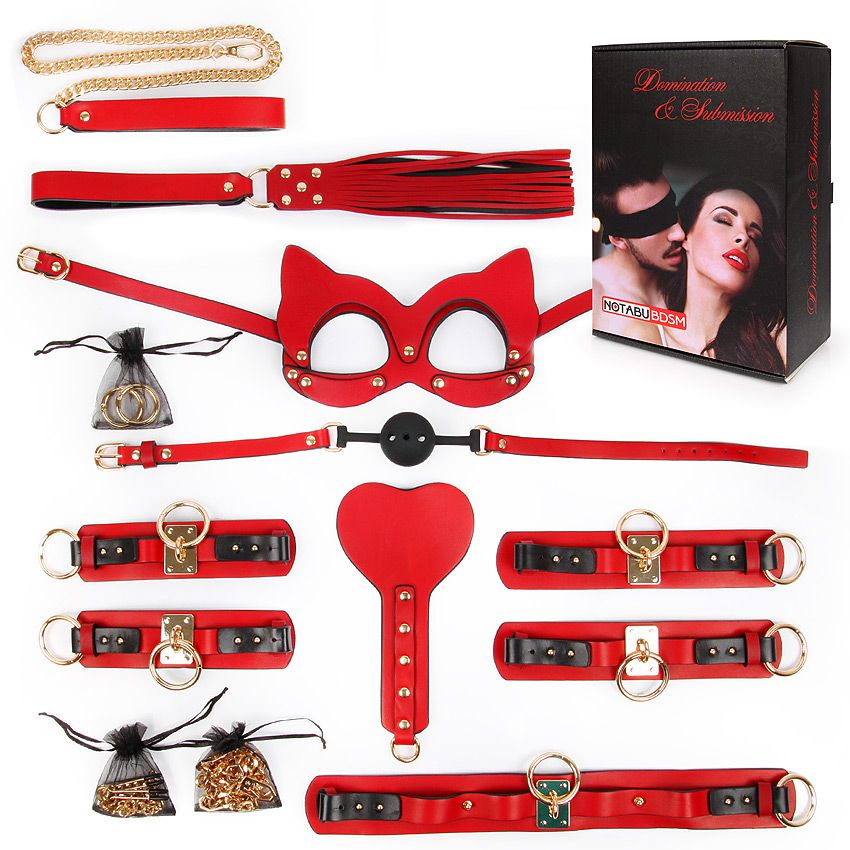 Великолепный набор аксессуаров для любителей БДСМ-игр. В комплект входят маска с ремешками, ошейник, цепочка-поводок, кляп, наручники, оковы, плеть, шлёпалка, зажимы для сосков, запасные колечки для соединения интимных аксессуаров между собой. Наручники, оковы, ошейник и маска имеют возможность регулирования размера. Плеть-флоггер состоит из хвостов и ручки-петли. Кляп оснащён шариком с отверстиями для дыхания. В комплекте: наручники, оковы, маска, ошейник, плеть, поводок, кляп, шлёпалка, зажимы.