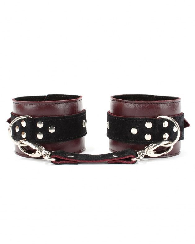 Наручники выполнены из натуральной кожи цвета бордо. Изделие декорировано ремнями из замши черного цвета. Обратная сторона изделия тоже выполнена из черной замши. По середине наручника расположено полукольцо из сварной фурнитуры. Наручники надежно фиксируются пряжками и ремнями, позволяющими выбрать нужный размер, подойдут на обхват руки от 16 до 25 см. Кожаное соединение на карабинах фиксирует наручники вместе. Стильные наручники отлично подходят для воплощения эротических БДСМ игр. Ширина - 6 см.