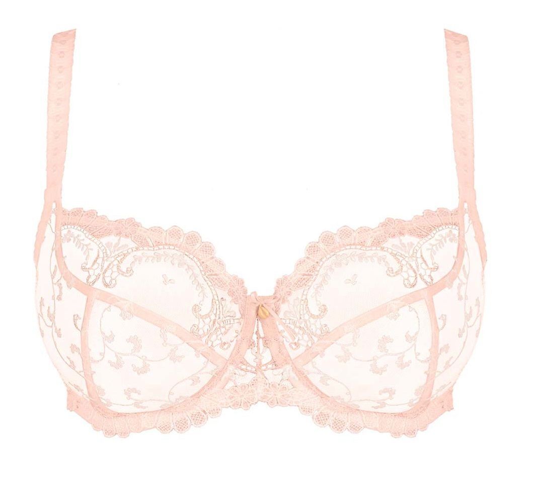 Бюстгальтер-балконет с мягкими чашками, на каркасах. Его глубокий вырез позволяет носить одежду с самыми обольстительными декольте, а крой из 3 частей обеспечивает максимальную поддержку и необходимый комфорт. Великолепный дизайн придает этой необычайно женственной коллекции утонченность и обольстительность. Изысканная и эффектная декоративная вышивка, изящные плиссированные бретели и перламутровая жемчужина подчеркивают великолепную работу мастеров корсетного белья.