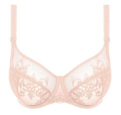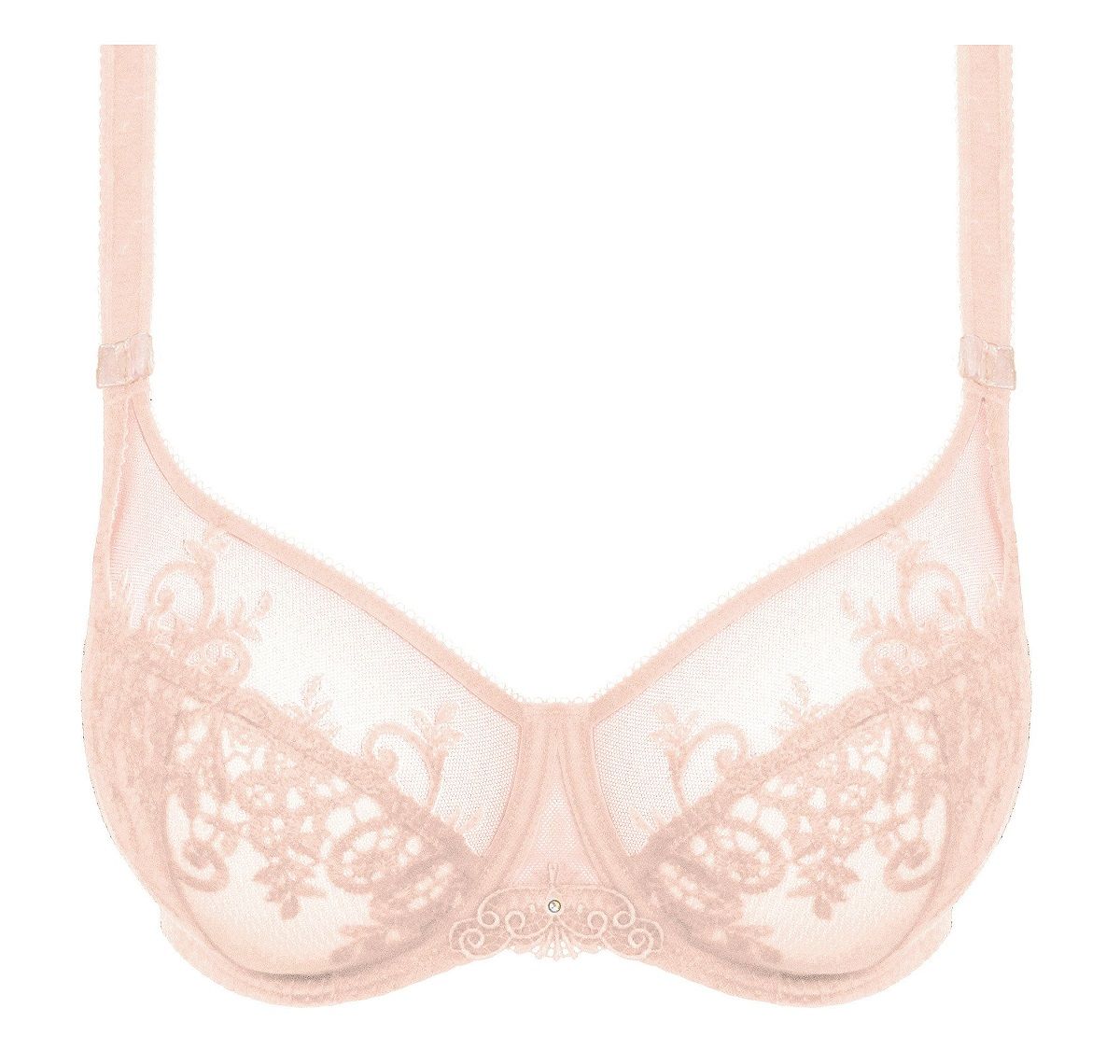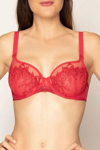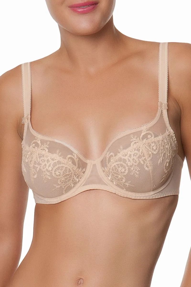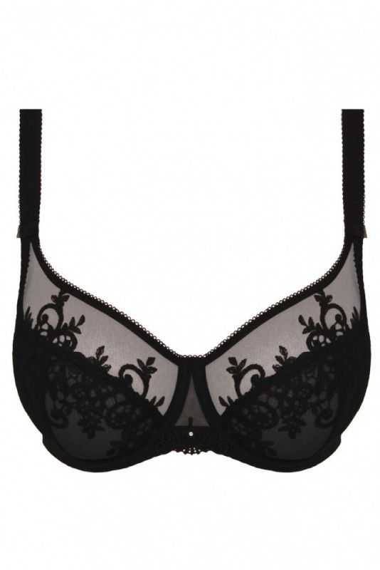 Бюстгальтер-балконет с мягкими чашками на каркасах. Сочетание прозрачных и непрозрачных участков, образованных вышивкой, размещенной в центре чашки, является неоспоримым преимуществом этого невероятно изысканного бюстгальтера. Эта модель тем не менее обладает хорошей поддержкой, так как она снабжена подкладкой из тюля. Линия декольте подчеркнута миниатюрными эластичными петельками. Великолепный гипюр со стразом украшает бюстгальтер и придает ему особый шик.