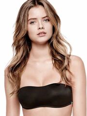 Бюстгальтер-бандо с мягкими двуслойными чашками, без косточек. Съемные формованные вкладыши без пуш-ап. Бочок усилен вертикальными, гибкими пластинами. По всему верхнему и нижнему краю проложена силиконовая лента для лучшей фиксации на стане. Застежка в два ряда на три позиции. Выполнен из эластичной, мягкой микрофибры. Коллекция Micro.