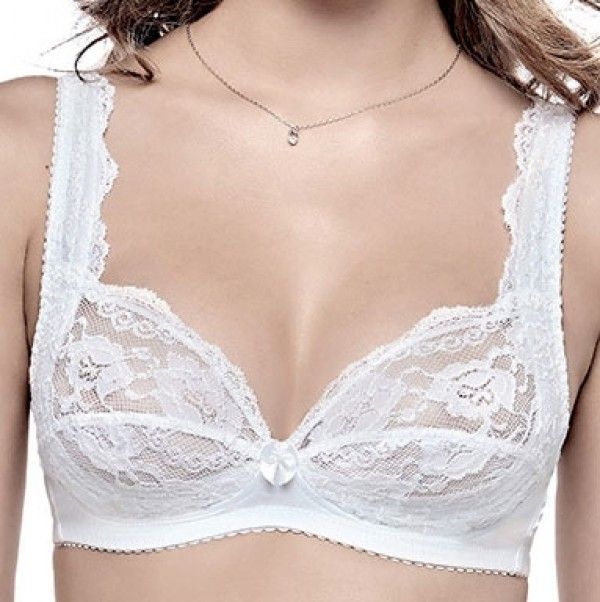Бюстгальтер с мягкой чашкой, без косточек, из кружевной полупрозрачной ткани. Декорирован небольшим бантиком.