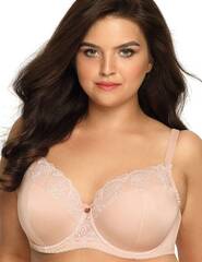 Бюстгальтер на косточках с боковыми поддержками, чашки шитые, на тонком поролоне, внутренняя сторона прошита хлопковым трикотажем, снаружи верхняя часть чашки декорирована сеткой с вышивкой. Бретельки регулируются по длине, на спине застёжка – удлинитель на крючках, фурнитура металлическая цвета меди.