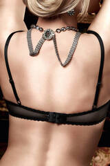 Окунитесь в благородную экстравагантность, которая очаровательно окружит Вас лестью. Полумягкие чашечки черного бюстгальтера, которые покрыты сверкающим материалом в белую полоску, придают благородный внешний вид. Тонкие кружевные аппликации в нежном дизайне с цветочным узором украшает декольте. С косточками.