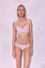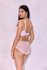 Бюстгальтер Hush Blush выполнен на основе бюста Beverly M с мягкими чашками на косточках, с дополнительными боковыми поддержками, чашки шитые из кружева с ресничками , продублированы белой сеткой. Спинка из двух слоев стабилизирующей сетки, резинки контрастного сиреневого цвета. Бретельки регулируются по длине, не отстёгиваются. На спине застёжка на удлинитель, количество крючков в ряду застёжки увеличивается пропорционально размеру бюстгальтера, фурнитура металлическая цвета желтого золота.
