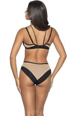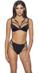 Бюстгальтер Leah выполнен на косточках, чашки мягкие шитые неэластичной ткани черного цвета и телесной сетки. Мягкие чашки, изготовленные с особой тщательностью, полностью закрывают грудь, обеспечивая ее естественную форму и стабильную поддержку. Бретельки бюста не отстёгиваются, регулируются по длине, пояс из микрофибры и телесного цвета сетки. На спине застёжка на удлинитель на 2 крючка. В зоне декольте несъемные черные декоративные полосы, идущие вверх по вырезу, обогащенные мягкими декоративными элементами, подсвеченными золотом, сзади переходят в тонкие бретели, дополнительно поддерживают бюст, регулируются по длине. Фурнитура металлическая цвета желтого золота. У бюстгальтеров Novika довольно тугой пояс, который адаптируется под тело после нескольких дней носки или одной-двух стирок. Рекомендуем использовать удлинитель пояса бюстгальтера на первое время либо выбирать следующий за «своим» размер, с поясом длиннее.