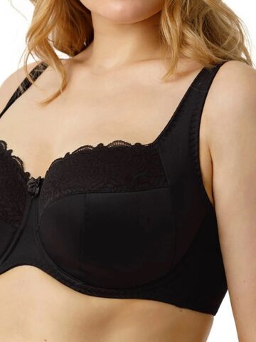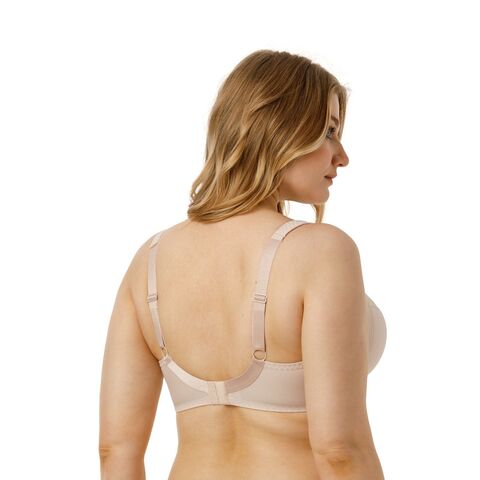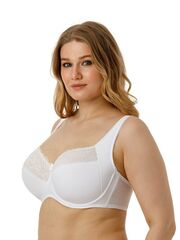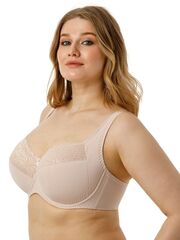 Бюстгальтер на каркасах с полудублированной чашкой. Чашки овальной формы с диагональным членением и боковым подрезом создают округлую наполненную форму и обеспечивают надёжную, высокую и комфортную поддержку груди. Усиленная бретель снимает нагрузку с плечевого пояса. Широкий стан с боковыми упругими пластинами плотно облегает тело и обеспечивает стабильную комфортную посадку бюстгальтера на фигуре.