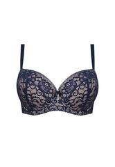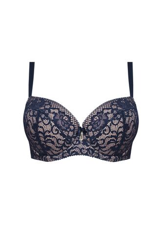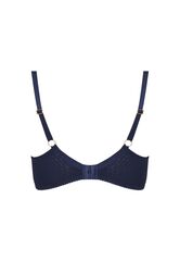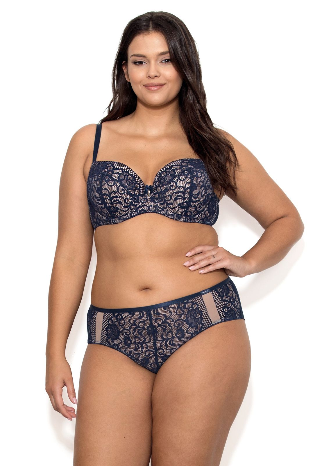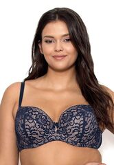 Бюстгальтер на косточках, с боковыми поддержками, чашки шитые, на тонком поролоне, с кармашками для съёмных пуш-ап вкладышей, внутренняя сторона проложена хлопковым трикотажем, внешняя сторона покрыта кружевом. На спине застёжка на удлинитель, количество крючков увеличивается пропорционально размеру.