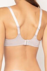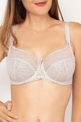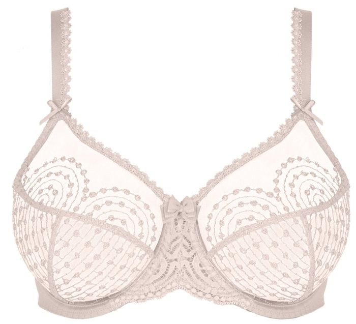 Бюстгальтер с классическими мягкими чашками на каркасах, с кроем из 3-х частей, который также высоко облегает и поддерживает грудь, вплоть до чашки H. Высокий эстетический результат достигается за счет сочетания изысканной «фиксированной» вышивки и великолепного тюля, обеспечивающего визуальную легкость и чистоту линий. Чашки бюстгальтера снабжены подкладкой из прочного материала — залога непрозрачности и поддержки.