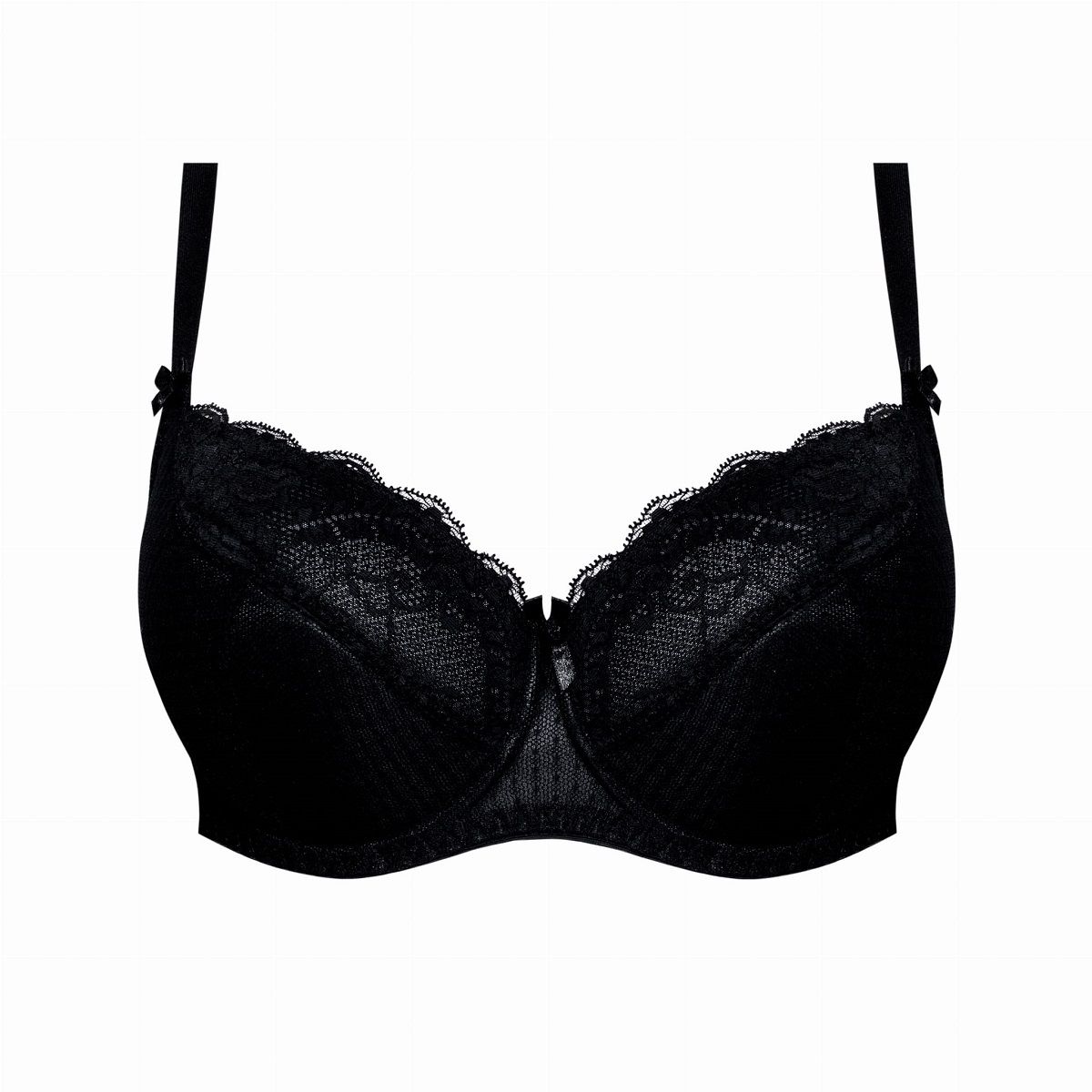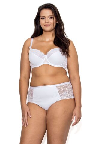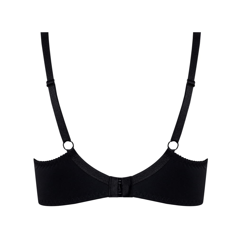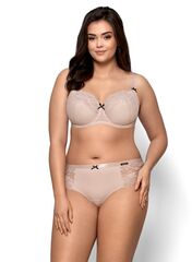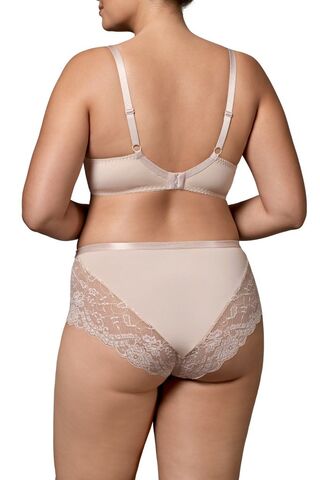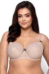 Бюстгальтер Pia PU с дополнительными боковыми поддержками, чашки шитые, на косточках, нижняя часть на тонком поролоне, покрытом сеткой в мелкий горох, верхняя из кружева, продублированного сеткой в тон, внутри чашечки проложены хлопковым трикотажем. Спинка из микрофибры продублирована сеткой. Бретельки пришиты, регулируются по длине. На спине застёжка на удлинитель, количество крючков в ряду застёжки увеличивается пропорционально размеру бюстгальтера, фурнитура металлическая крашеная.