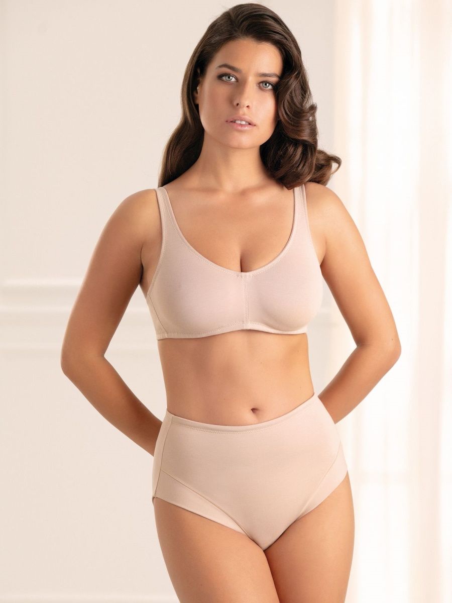 Бюстгальтер с бесшовными мягкими чашками, широким соединением чашек и скрытыми каркасами. Выполнен из смесового материала с высоким содержанием хлопка. Расширенные хлопковые бретели с ограниченной растяжимостью регулируются сзади, становясь эластичными. Ширина бретелей увеличивается с увеличением размера. Соответствие размеров женского белья: 44RUS-2IT-S, 46RUS-3IT-M, 48RUS-4IT-L, 50RUS-5IT-XL, 52RUS-6IT-2XL, 54RUS-7IT-3XL, 56RUS-8IT-4XL, 58RUS-9IT-5XL, 60RUS-10IT-6XL.