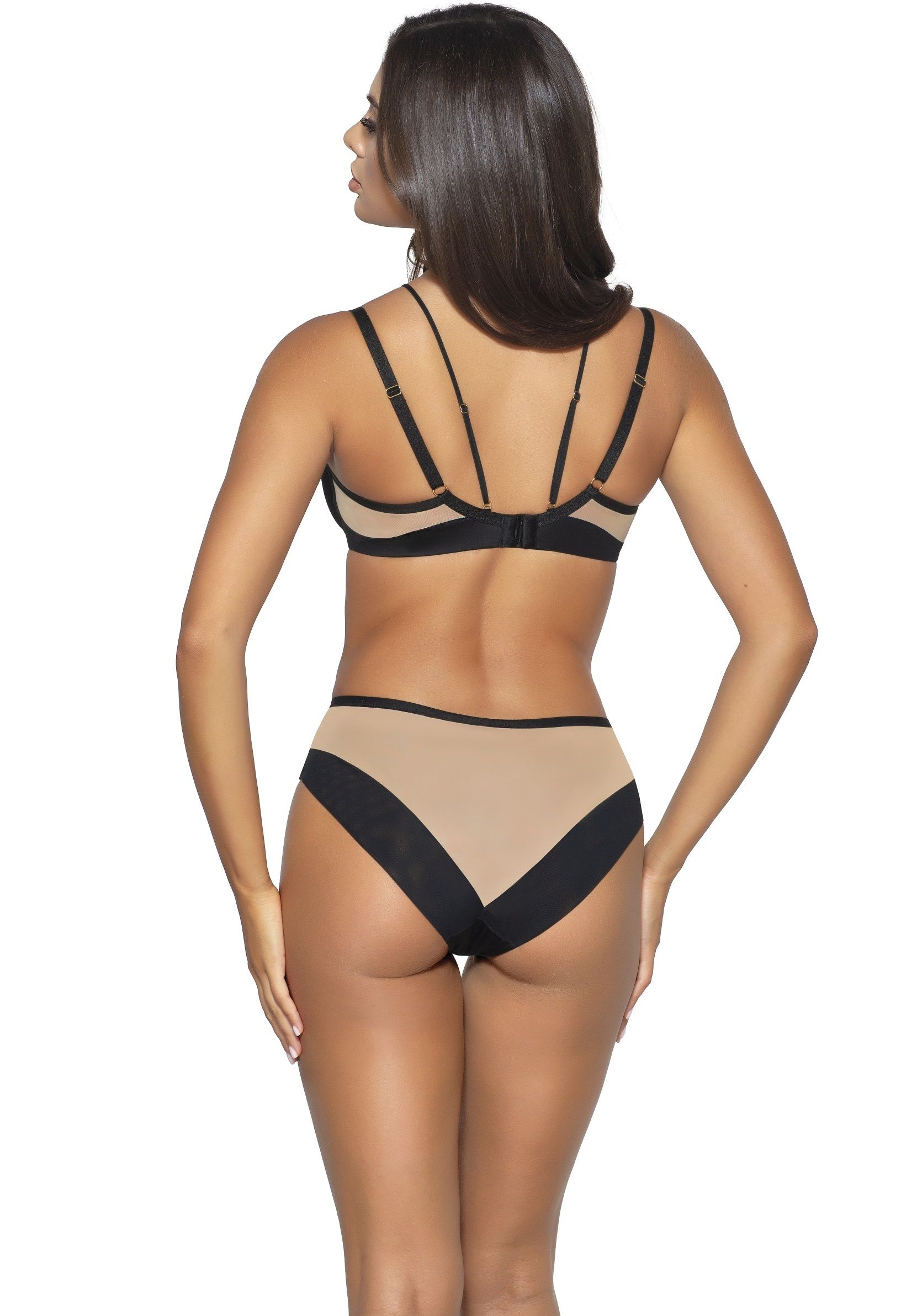Бюстгальтер Leah выполнен на косточках, чашки шитые, нижняя часть чашки на тонком поролоне, внутренняя сторона проложена хлопком, внешняя сторона из микрофибры черного цвета, верхняя часть из телесной сетки. Бретельки бюста не отстёгиваются, регулируются по длине, пояс из микрофибры и телесного цвета сетки. На спине застёжка на удлинитель на 2 крючка. В зоне декольте несъемные черные декоративные полосы, идущие вверх по вырезу, обогащенные мягкими декоративными элементами, подсвеченными золотом, сзади переходят в тонкие бретели, дополнительно поддерживают бюст, регулируются по длине. Фурнитура металлическая цвета желтого золота. У бюстгальтеров Novika довольно тугой пояс, который адаптируется под тело после нескольких дней носки или одной-двух стирок. Рекомендуем использовать удлинитель пояса бюстгальтера на первое время либо выбирать следующий за «своим» размер, с поясом длиннее.