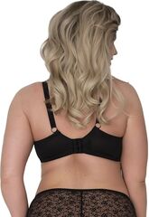 Бюстгальтер выполнен на косточках, с боковыми поддержками для предотвращения скатывания пояса, чашки мягкие шитые из гипюра с цветочным рисунком, с Т-образным швом, продублированы сеткой. Спинка из плотной стабилизирующей сетки. Бретельки пришиты, регулируются по длине, на спине застёжка - удлинитель на крючках, фурнитура металлическая крашеная.
