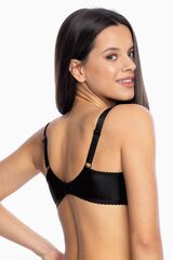 Бюстгальтер выполнен на косточках, с дополнительными боковыми поддержками, чашки шитые, из тонкой сетки и кружевного полотна с растительным рисунком (в черном варианте сетка телесного цвета), спинка из микрофибры. Бретельки не отстёгиваются, регулируются по длине, на спине застёжка - удлинитель на крючках, фурнитура металлическая крашеная.